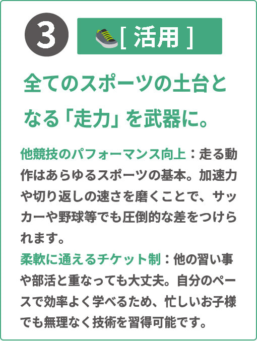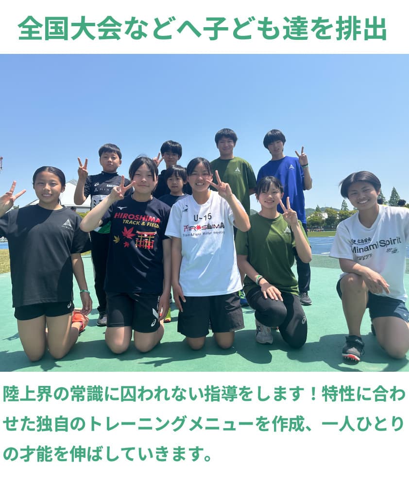 ③ 学校で部活に所属してるが監督が陸上経験者ではなかったり充分に練習環境がない子供達や、現状に満足していない方、ミライを変えたい方向けに立ち上げた陸上指導塾です。