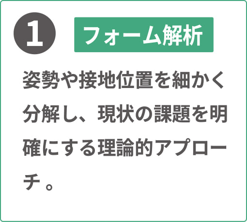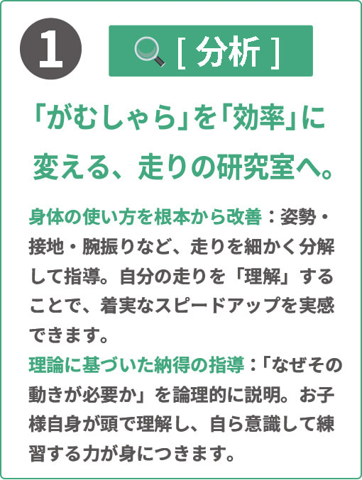 与えられた身体の中でいかに速く走るかそれが最も大切なことであり、選手の骨格や特徴を踏まえ改善するよう練習プログラミングを作成し、フォーム改善を運ぶ。当塾は一人一人指導内容は異なると考え、他にない唯一無二の指導方法となっています。スポーツ学を押し付けるのではなく、選手が次のステップに行く為「個人に寄り添う」選手にとってどうすれば良い結果が出るかをコミットするコースになります。
